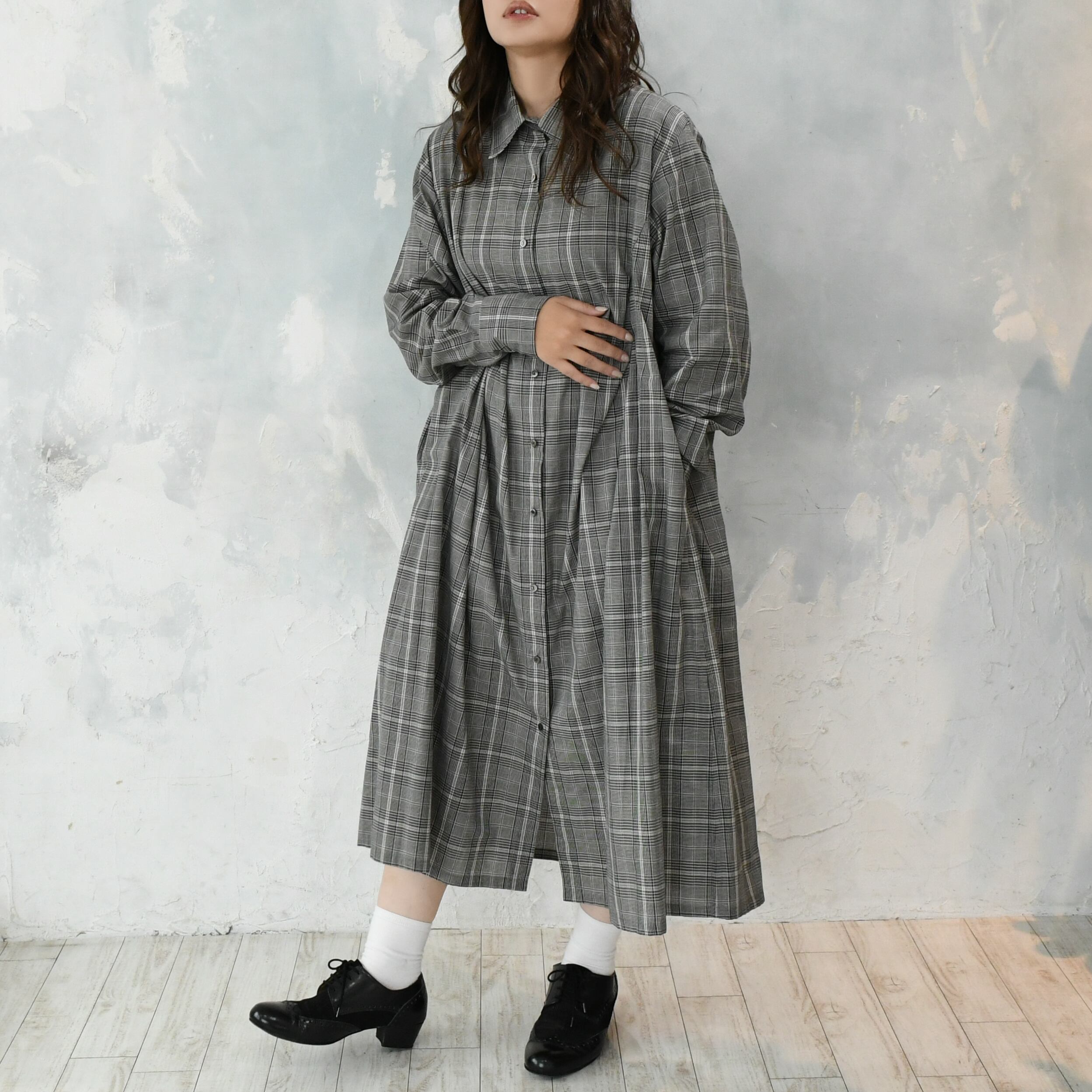【完全一点物】胸元タックワンピース(グレンチェック)