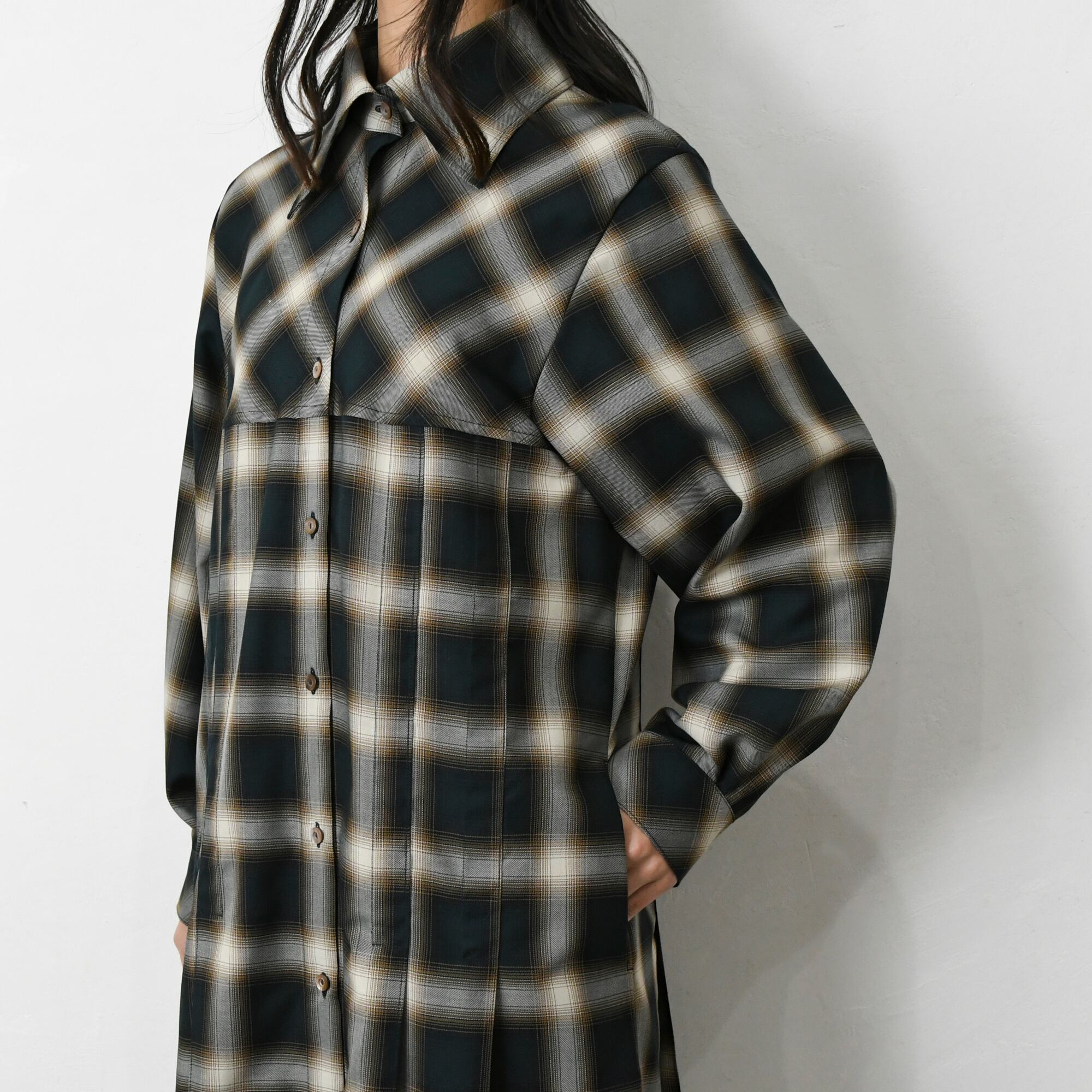 深みのあるグリーンのチェック柄が、一枚で秋冬色にしてくれます。