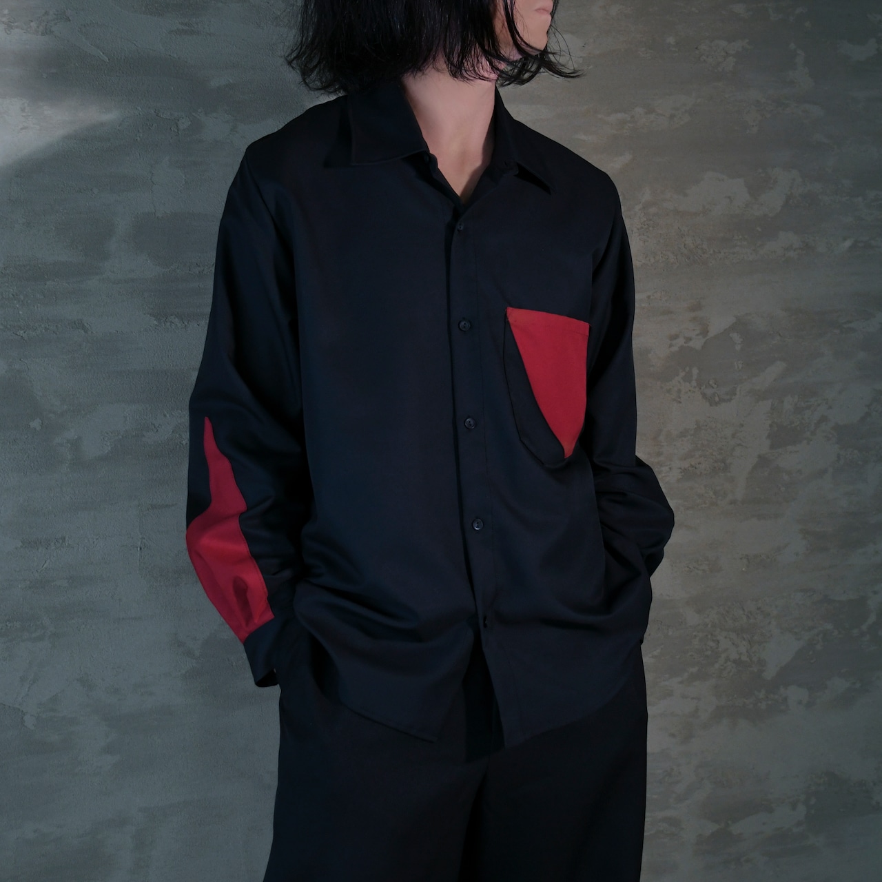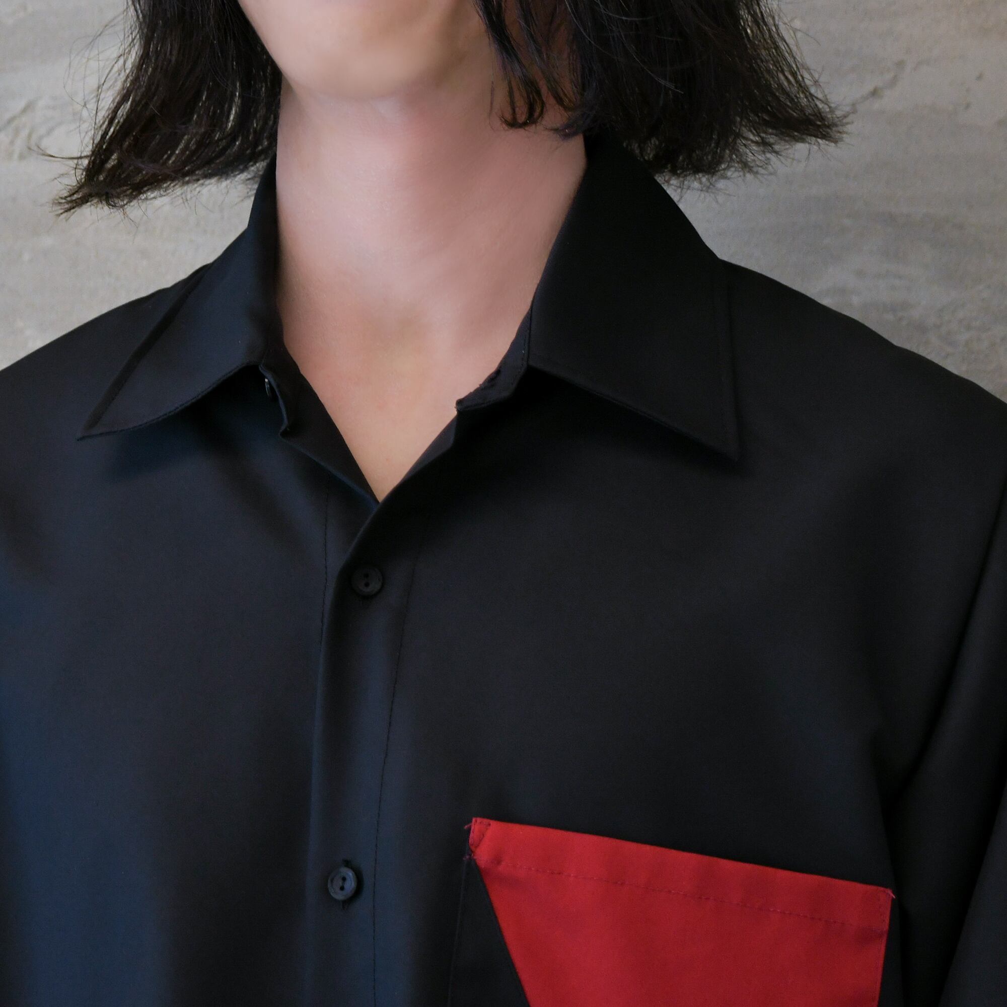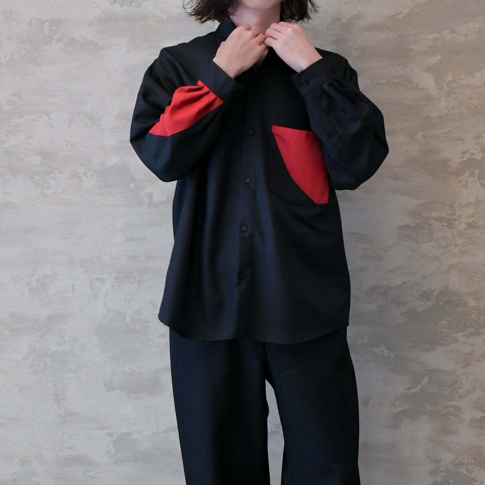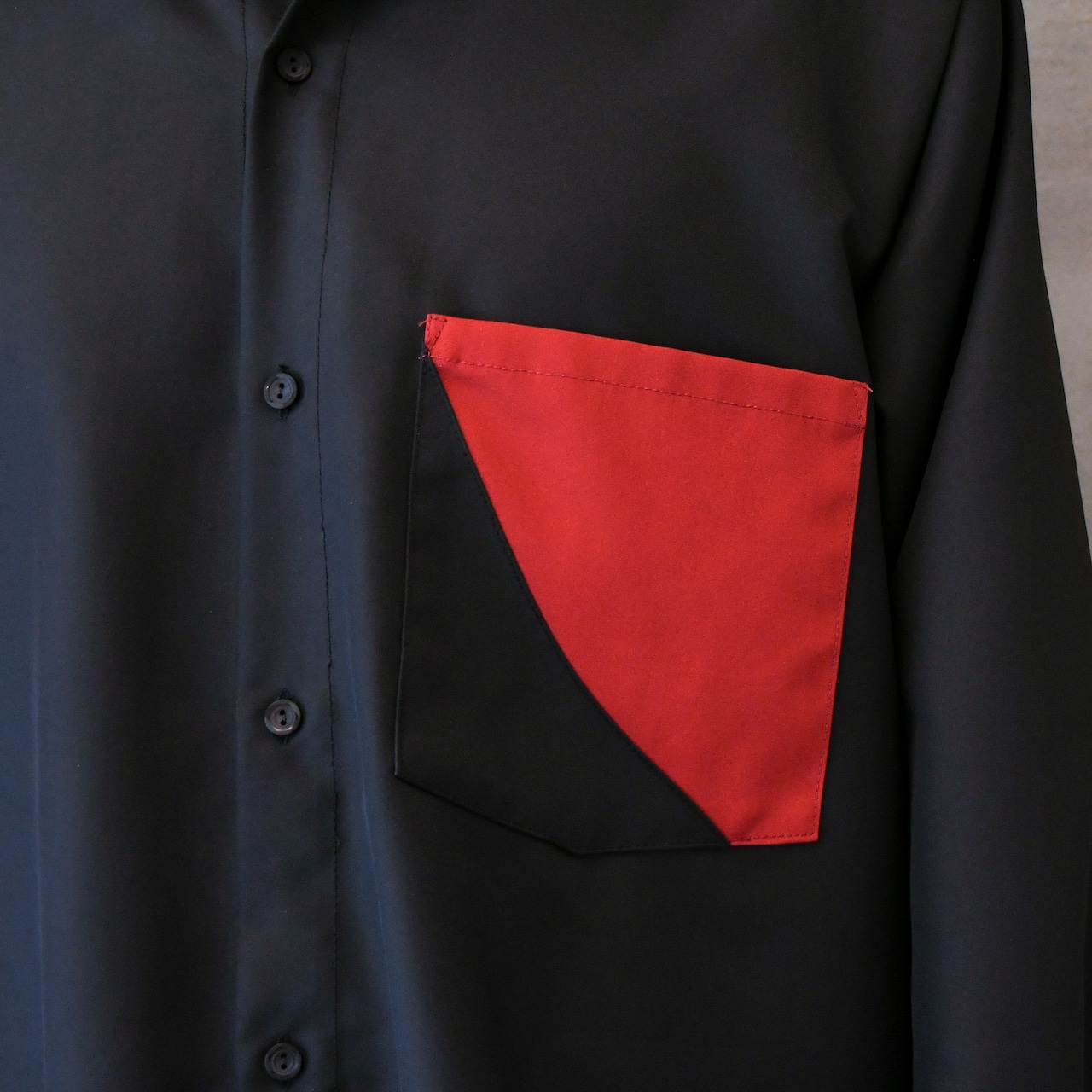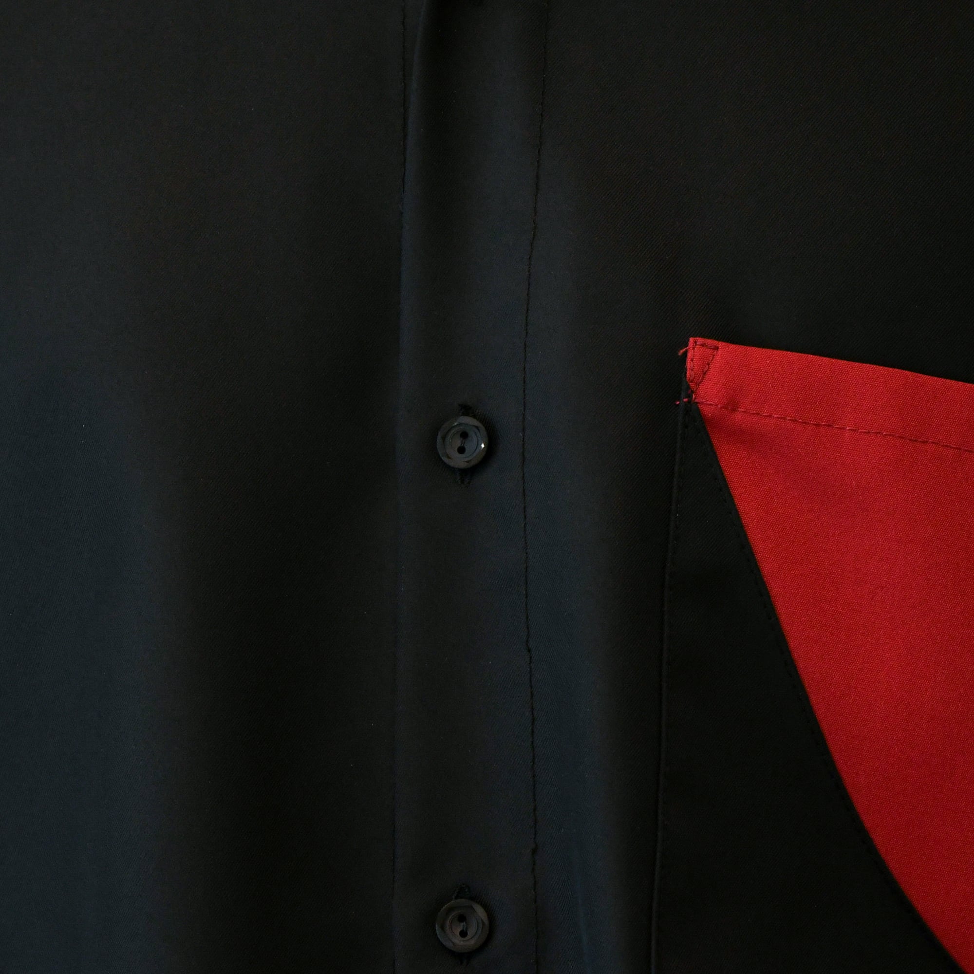 ブラックの生地に鮮やかなレッドが映えるメンズシャツ。
