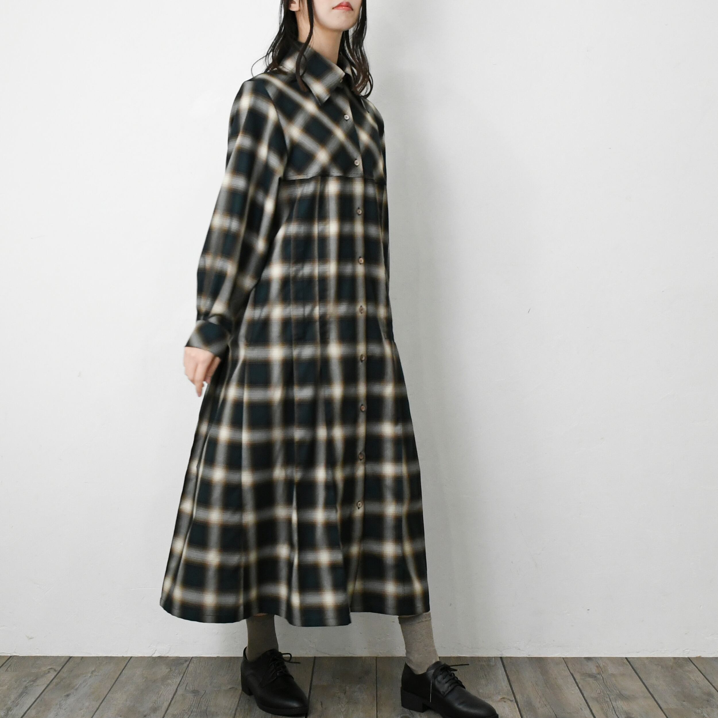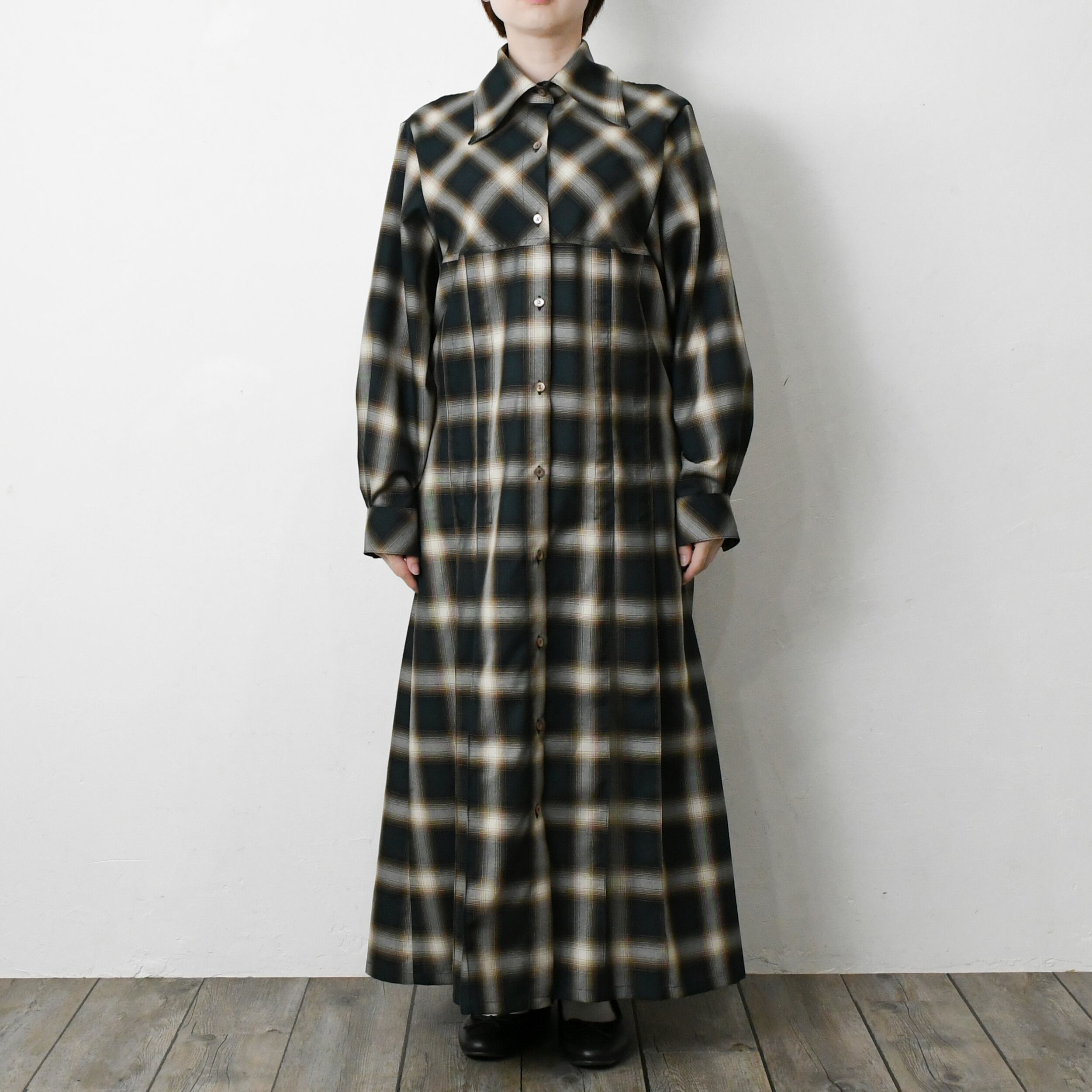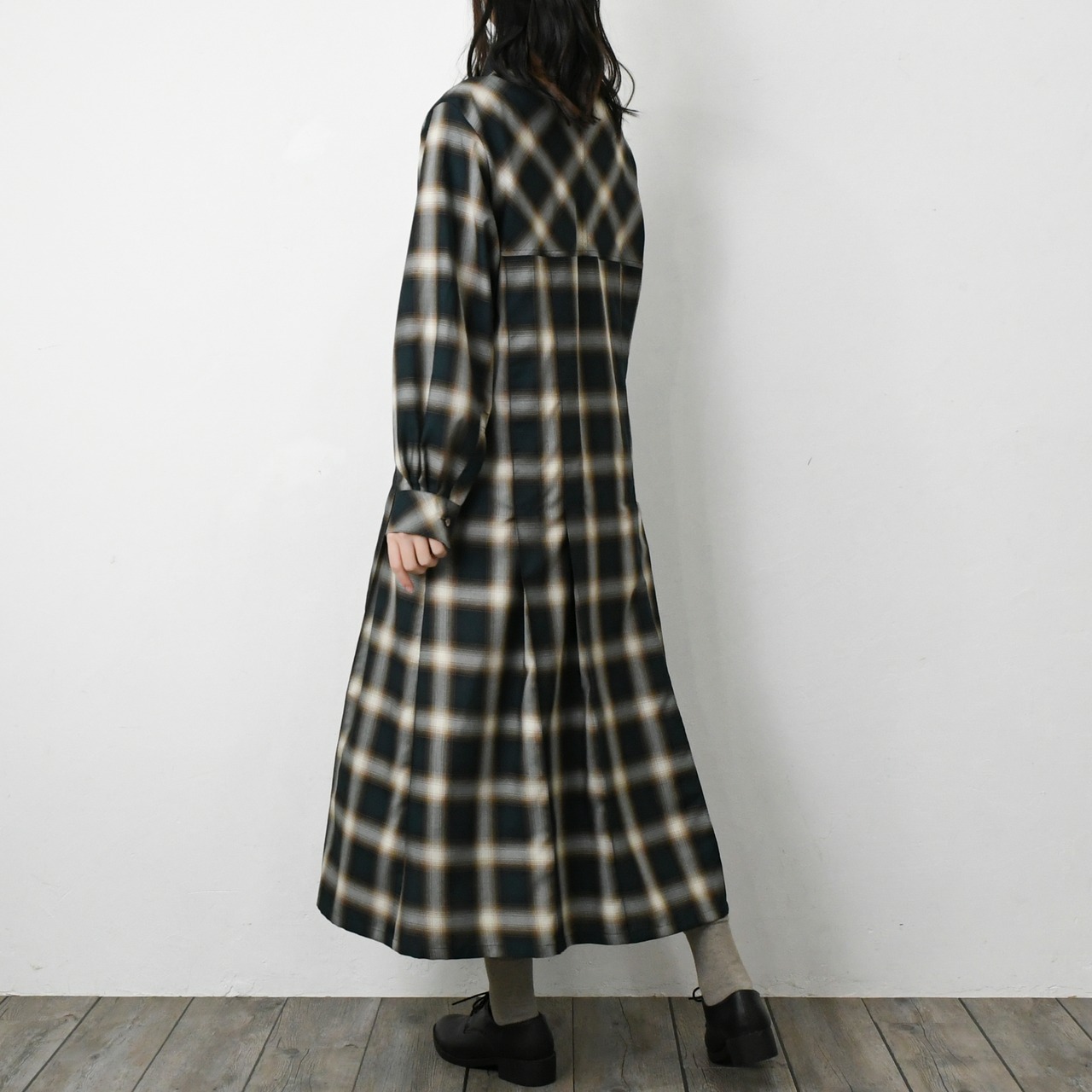 胸元から裾に向かい、プリーツが入ったワンピース。