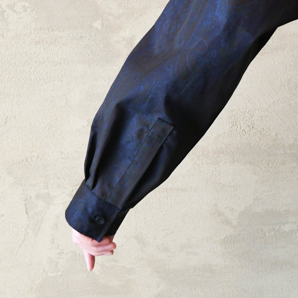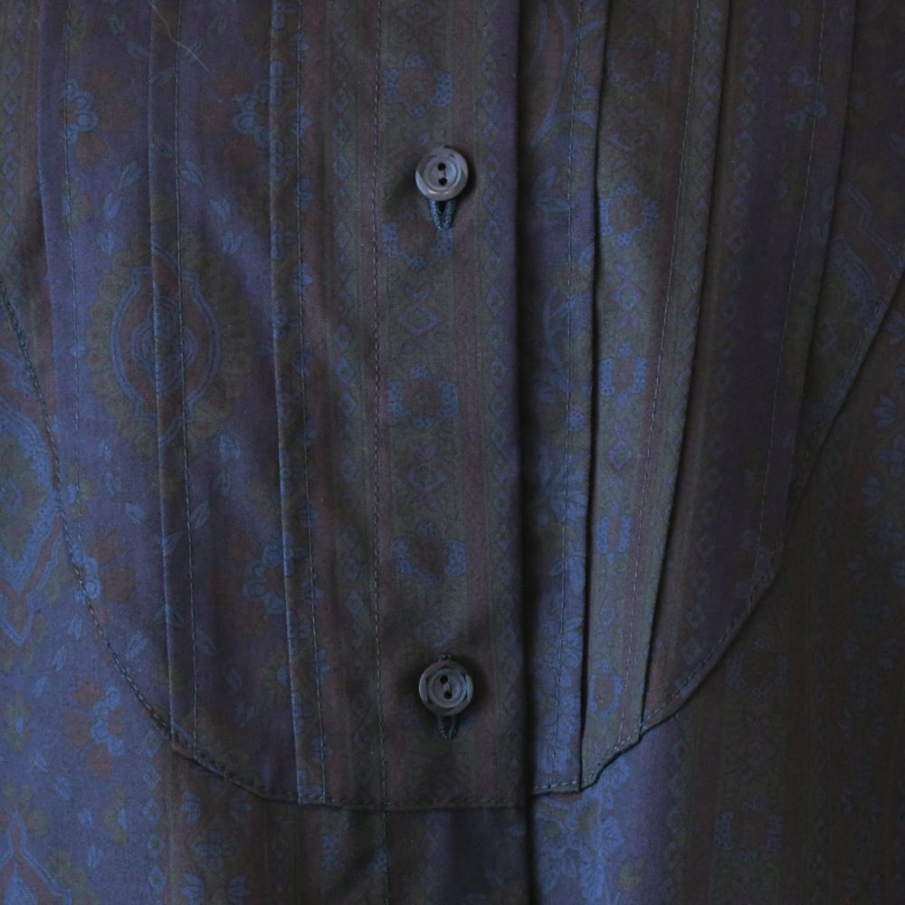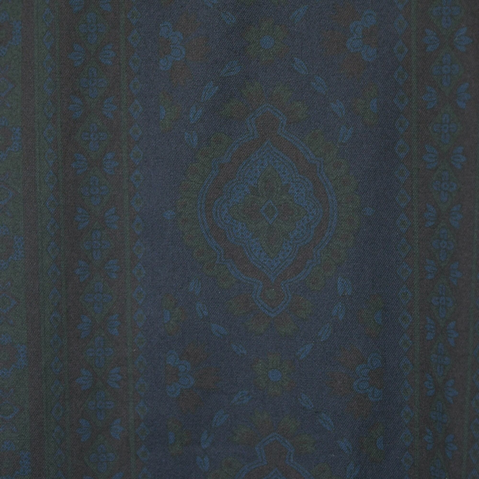 落ち着いた色味のネイビーの生地で、グリーンやボルドーなどのペイズリー柄です。
